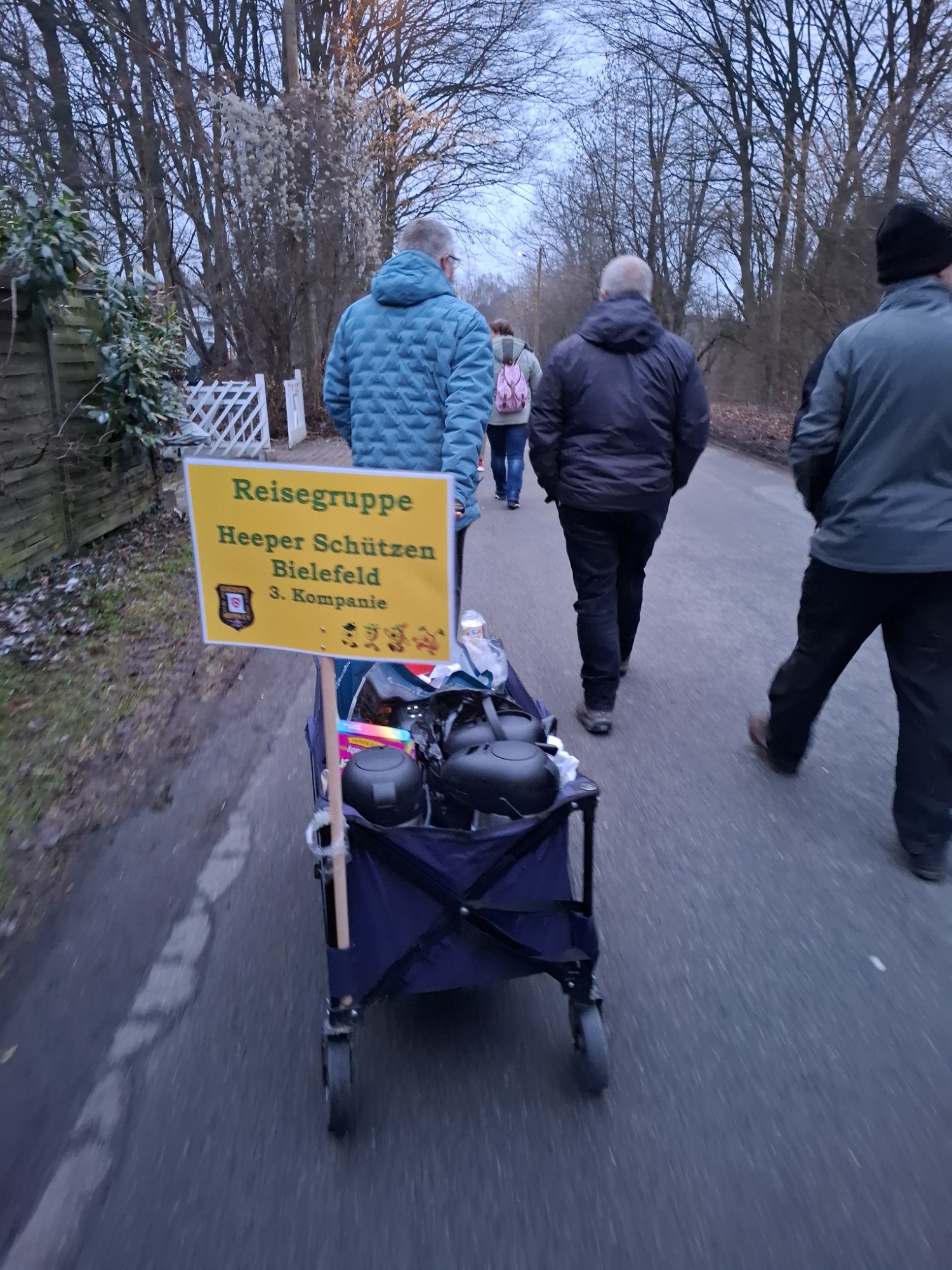 Der Bollerwagen war bestens ausgestattet: heißer Glühwein, Schnaps und Tee sorgten dafür, dass niemand frieren musste. Und kaum waren die ersten Meter geschafft, ertönte auch schon das neue KI-Lied der dritten Kompanie – spätestens beim Refrain konnte mitgesungen werden.