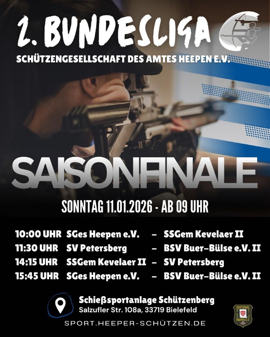 Das Highlight für unsere Sportler war sicherlich der Aufstieg unseren ersten Luftgewehrmannschaft in die 2. Bundesliga, denn dieser Erfolg stellt dieses Jahr alle anderen Erfolge in den Schatten. Ich gratuliere hier noch einmal den erfolgreichen Schützinnen und Schützen sowie dem Trainer und allen Beteiligten zu dieser tollen Leistung. Da sich die Mannschaft bei mittlerweile drei Siegen und zwei Niederlagen im Mittelfeld der Tabelle eingefunden hat, besteht eine berechtigte Hoffnung auf den Klassenerhalt. Der letzte Wettkampftag findet für unsere Mannschaft am 11.01.2026 bei uns auf dem Schützenberg statt. Im Anhang findet Ihr die Datei mit den Uhrzeiten, zu denen wir schießen und ich lade Euch alle ein, an diesem Tag unsere Mannschaft zu unterstützen. Es ist ein besonderes Erlebnis bei so einem spannenden Wettkampf die Sportler zu beobachten und mit Applaus weiter zu motivieren.