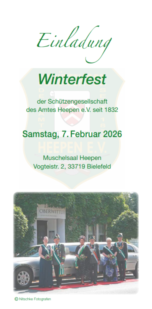 Damit nicht nur die Sportler das Vereinsleben wahrnehmen und die Traditionsschützen auch in Schwung kommen, findet am 7.Februar 2026 unser Winterball im Muschelsaal statt. Die Einladung ist im Anhang beigefügt. Wer in diesem Jahr Essen möchte, muss gleich beim Kartenvorverkauf ebenfalls das Essen bestellen, das in diesem Jahr vom Hotelrestaurant Oberwittler geliefert wird. Der Flyer kommt dieses Jahr nicht auf Papier per Post, sondern ebenfalls als Anhang zu diesem Schreiben mit.